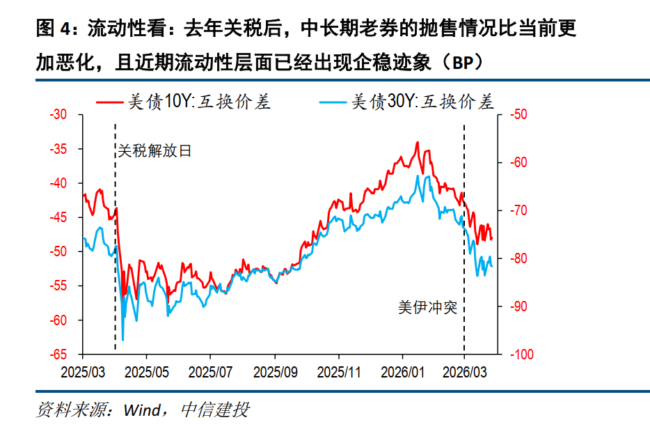 去年关税解放日后,10-30年美债和OIS的互换价差大幅走低,显示市场对相关老券的需求显著恶化,确实存在抛售的情况。